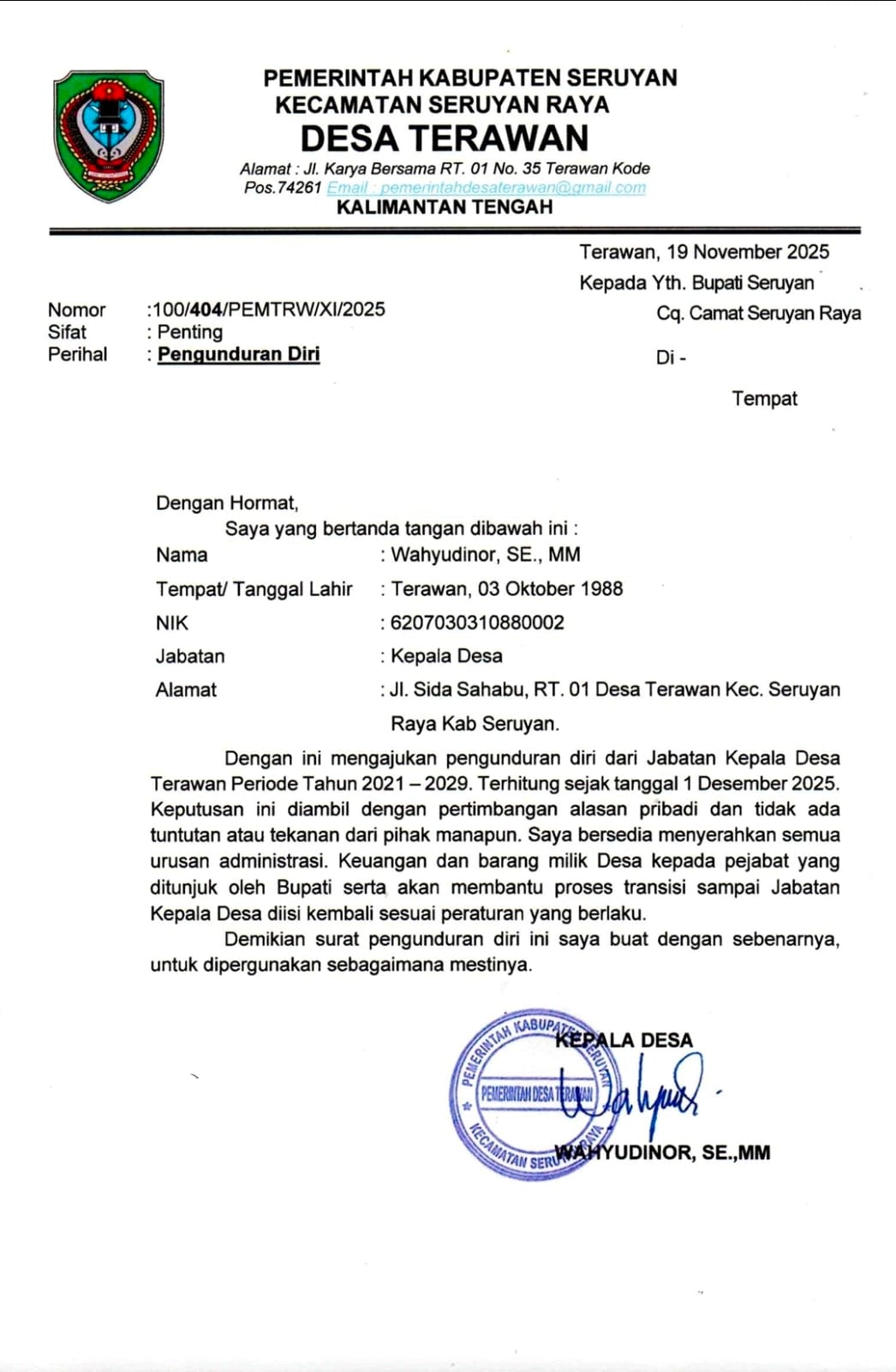 Kabar mundurnya Wahyudinor dari jabatan Kepala Desa Terawan semakin menguat setelah beredarnya surat pernyataan resmi yang ditandatangani langsung olehnya tertanggal 19 November 2025.